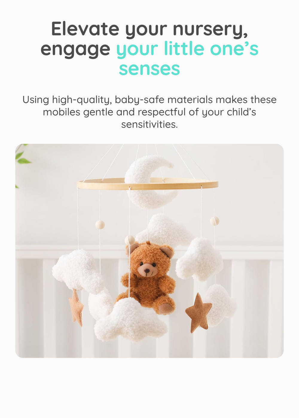 Each accessory is designed to ensure a safe and easy installation of your baby mobile. Our selection of mobile arms and the motor option allow you to adjust the height to the ideal level for your baby, providing both security and comfort while enhancing the nursery experience.