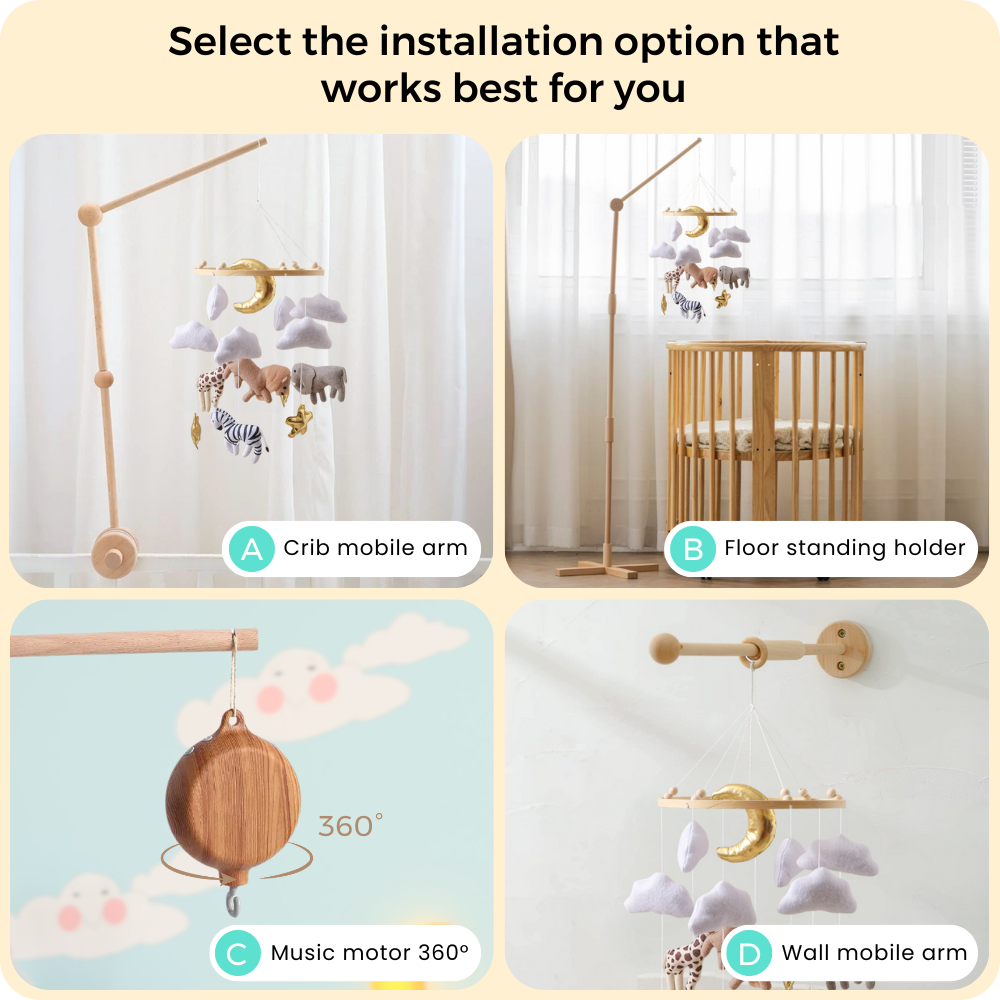 Nolibooshop mobile can be safely installed from the ceiling or paired with our natural beechwood arms (sold separately). Designed for safe and secure installation, it’s perfect for creating a soft, soothing atmosphere in your baby’s nursery.