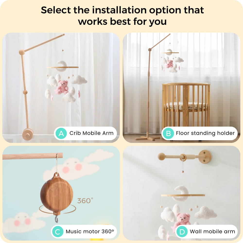 Nolibooshop mobile can be safely installed from the ceiling or paired with our natural beechwood arms (sold separately). Designed for safe and secure installation, it’s perfect for creating a soft, soothing atmosphere in your baby’s nursery.