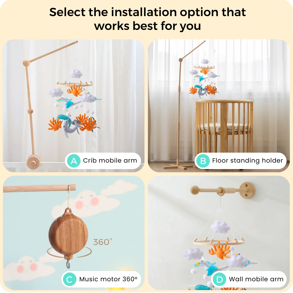 Nolibooshop mobile can be safely installed from the ceiling or paired with our natural beechwood arms (sold separately). Designed for safe and secure installation, it’s perfect for creating a soft, soothing atmosphere in your baby’s nursery.