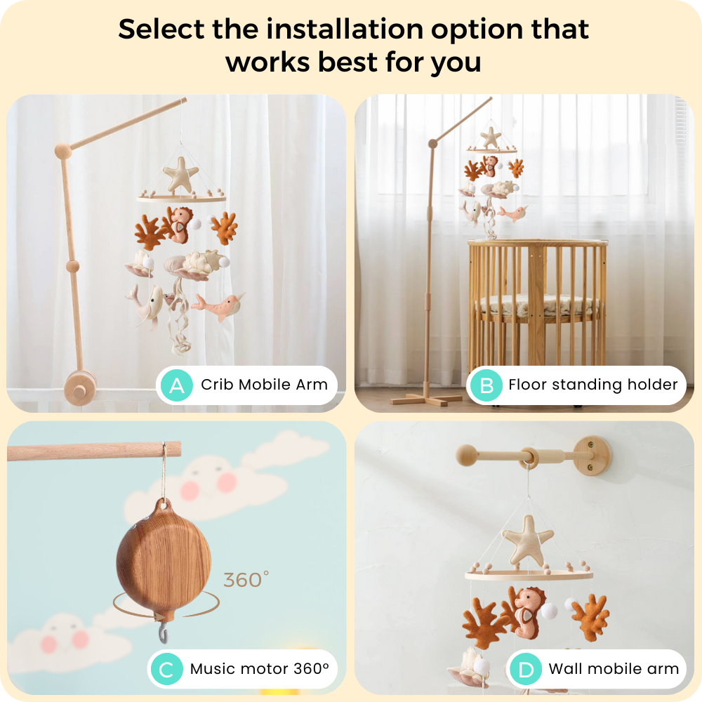 Every moment your baby spends watching the Nolibooshop mobile is a time of active learning and growth. By visually tracking the different elements, your baby strengthens eye muscles and develops spatial awareness, skills that will later support crawling, walking and even reading.