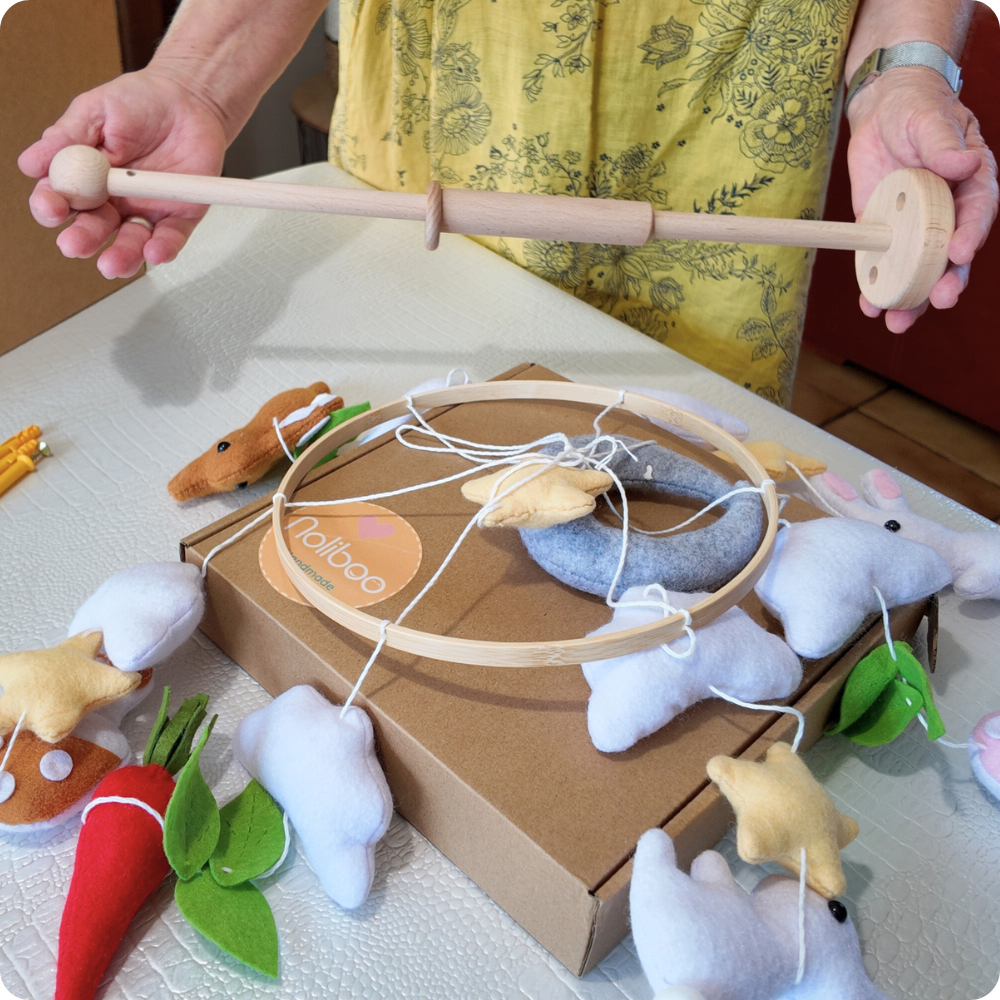 Nolibooshop was born from the desire to create unique handmade baby mobiles designed to stimulate little ones while gently decorating the nursery. Each mobile tells a story and becomes a true keepsake of those very first moments in life.