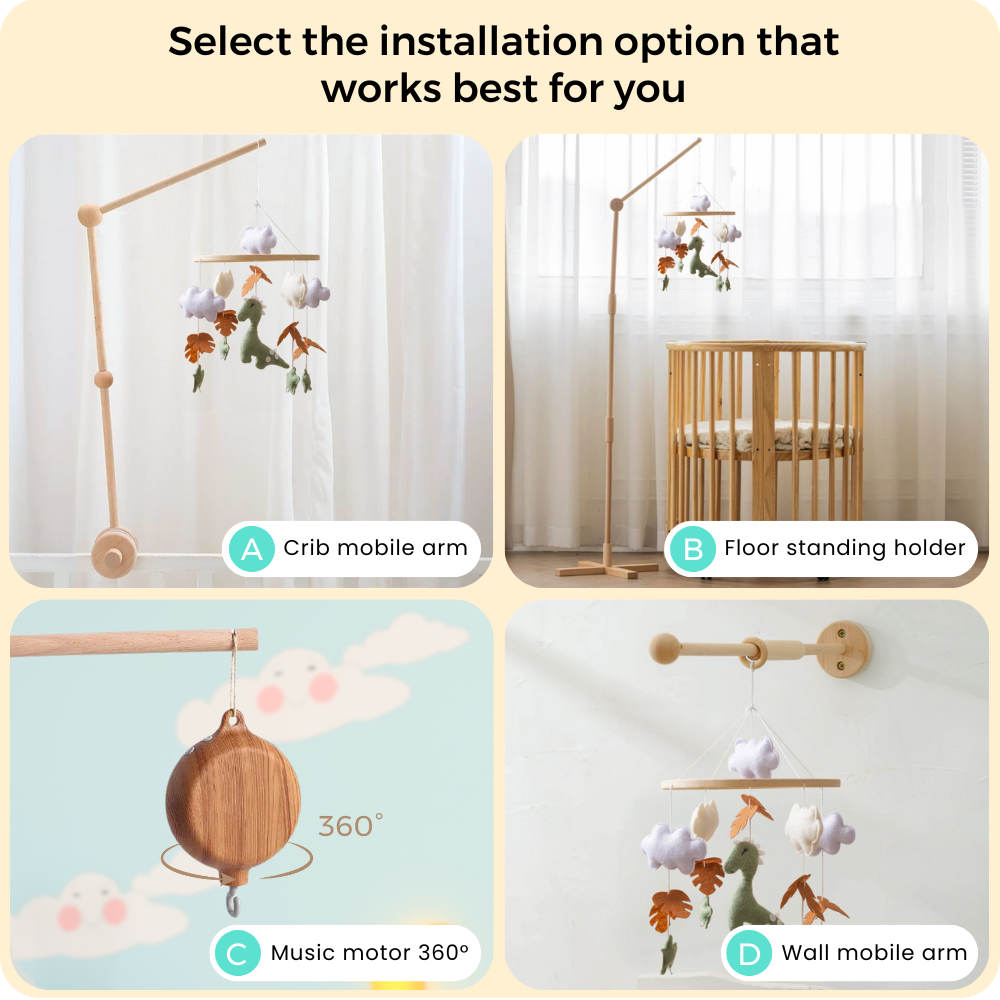 Every moment your baby spends watching the Nolibooshop mobile is a time of active learning and growth. By visually tracking the different elements, your baby strengthens eye muscles and develops spatial awareness, skills that will later support crawling, walking and even reading.